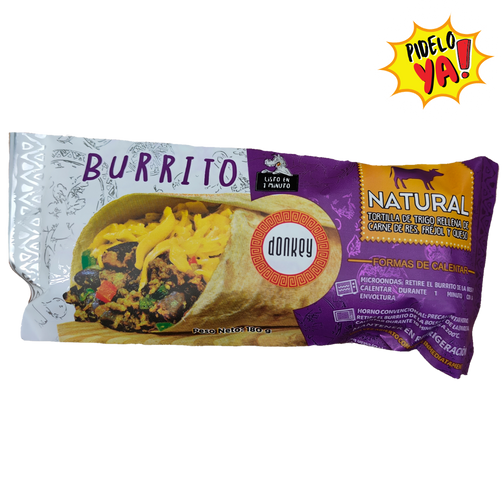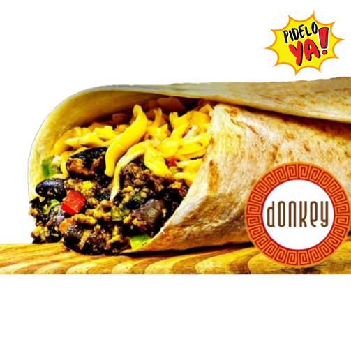 Tortilla de harina de trigo rellena de carne molida, queso cheddar, frejol negro y arroz.