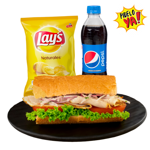 1 sánduche de pernil, 1 papa lays 34gr, 1 pepsi 400ml.