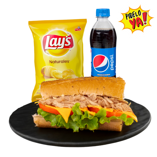 1 sánduche de pollo, 1 papa lays 34gr, 1 pepsi 400ml.
