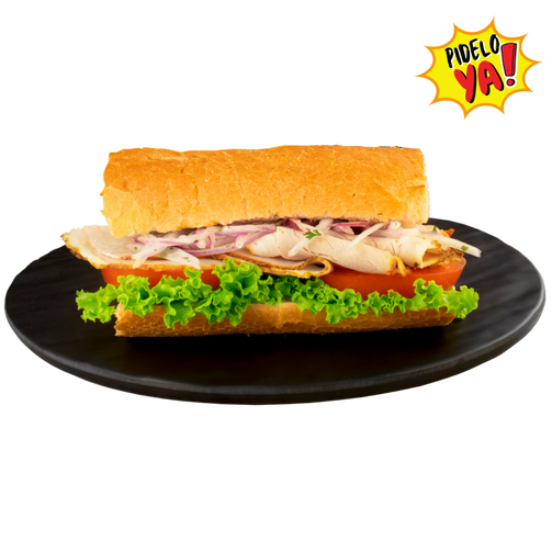Pan baguette, salsa de la casa, lechuga, tomate, cebolla, pernil a la plancha.