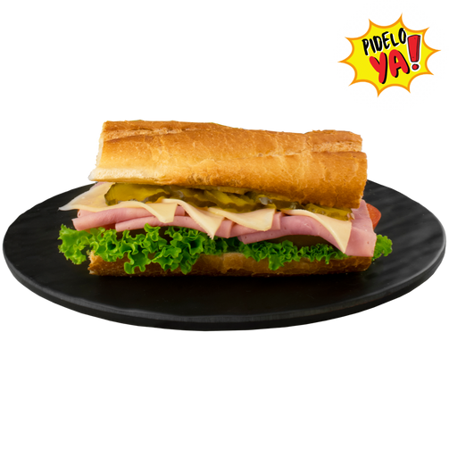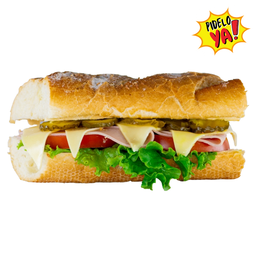 Pan Baguette, Jamón Americano, Queso holandés, Pickles, Vegetales, Salsa de la casa.