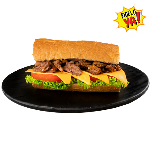 Pan Baguette, Lomo a la plancha, Queso cheddar, Tomate, Lechuga, Salsa de la casa.